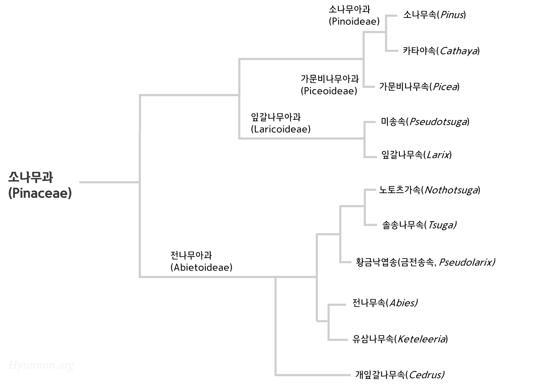 | 잎갈나무아과 (Laricoideae) | 카타야속/카타이아속 (Cathaya) - 단일종 | |