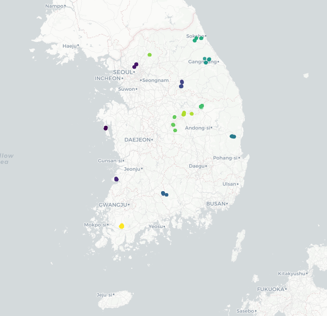 ## 데이터 GPX 좌표 입력 ## gps % as_tibble ## 공원별로 색 변경하기, code필드를 이용한 구분 ## pal % setView(lng=126.9784, lat=37.566, zoom=11) %>% addProviderTiles('CartoDB.Positron') %>% addCircles(lng=~long, lat=~lat, color=~pal(Code)) ## 기초 원본, 원표시 + 미니맵 ## l % setView(0,0,1) esri % addLayersControl(baseGroups = names(esri), options = layersControlOptions(collapsed = FALSE)) %>% addMiniMap(tiles = esri[[1]], toggleD..